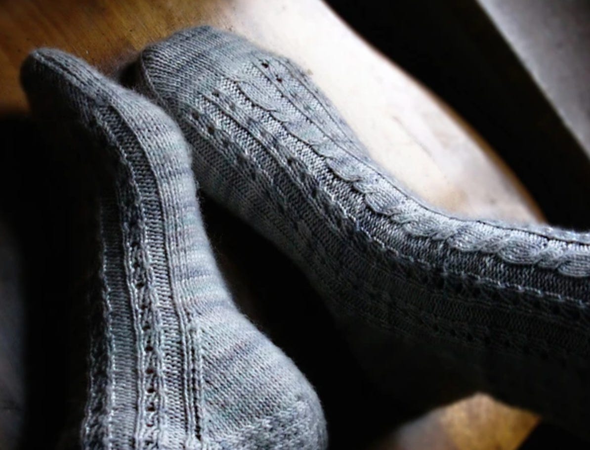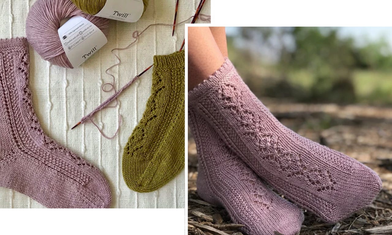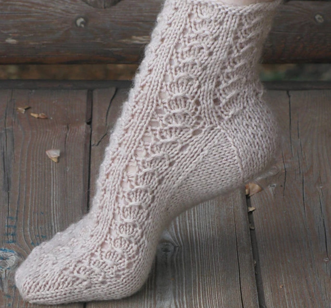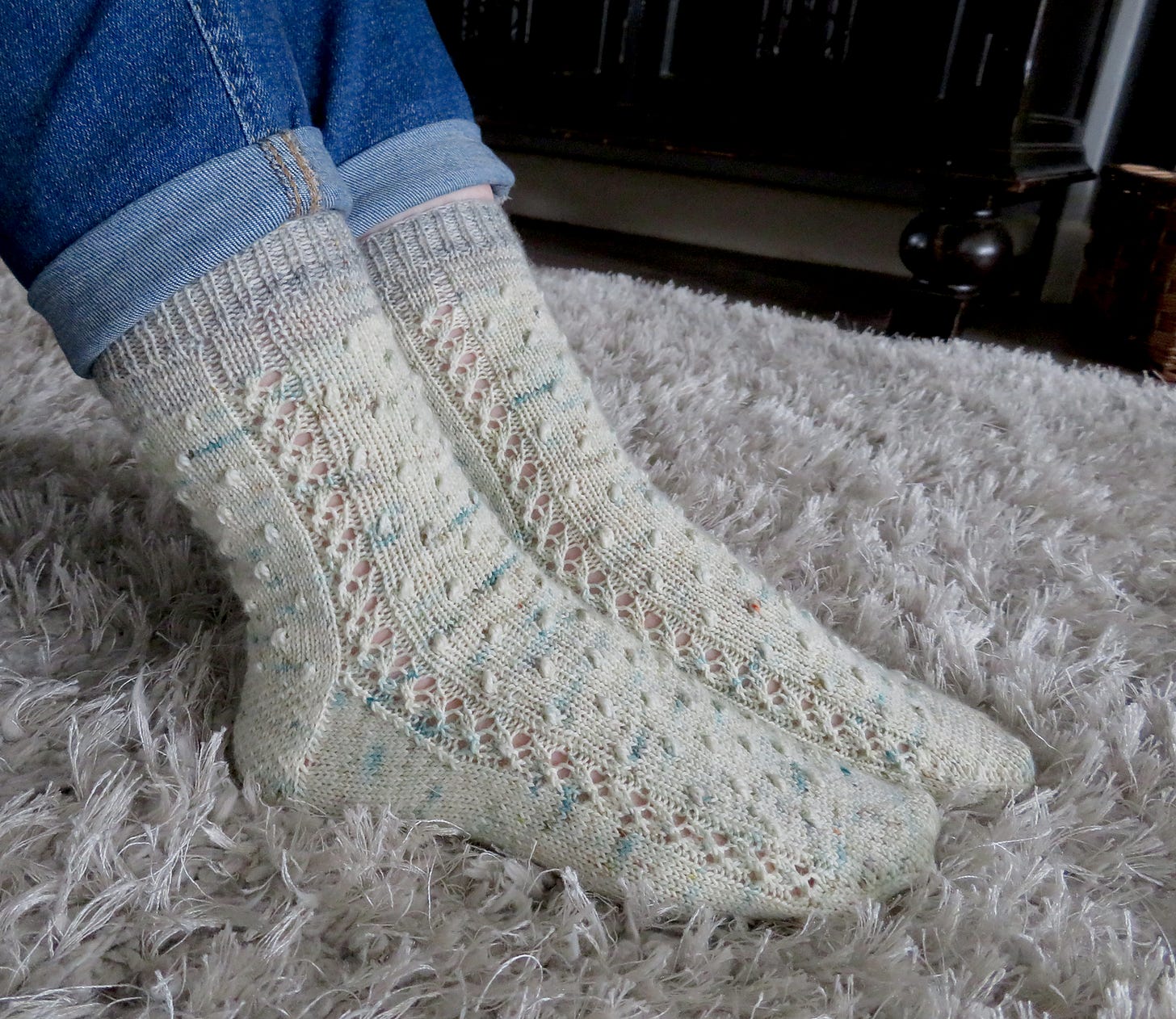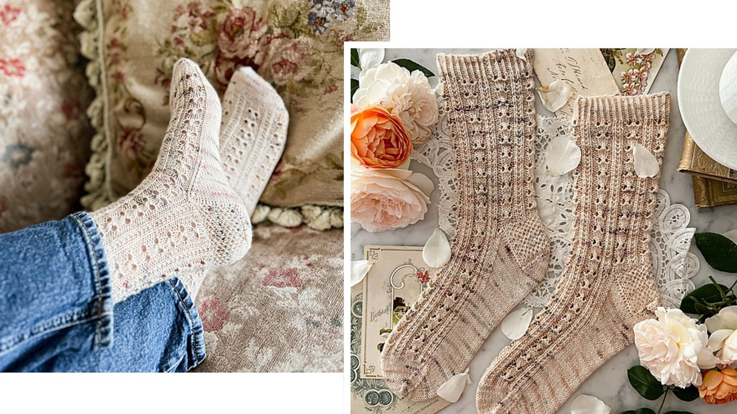 “These socks feature an elegant eyelet lace design, and are perfect for sunny summer days! The ultra-customizable pattern includes instructions for both a picot edge cuff and traditional ribbed cuff. It also includes two heel options and instructions for both mid-calf and shorty length.”