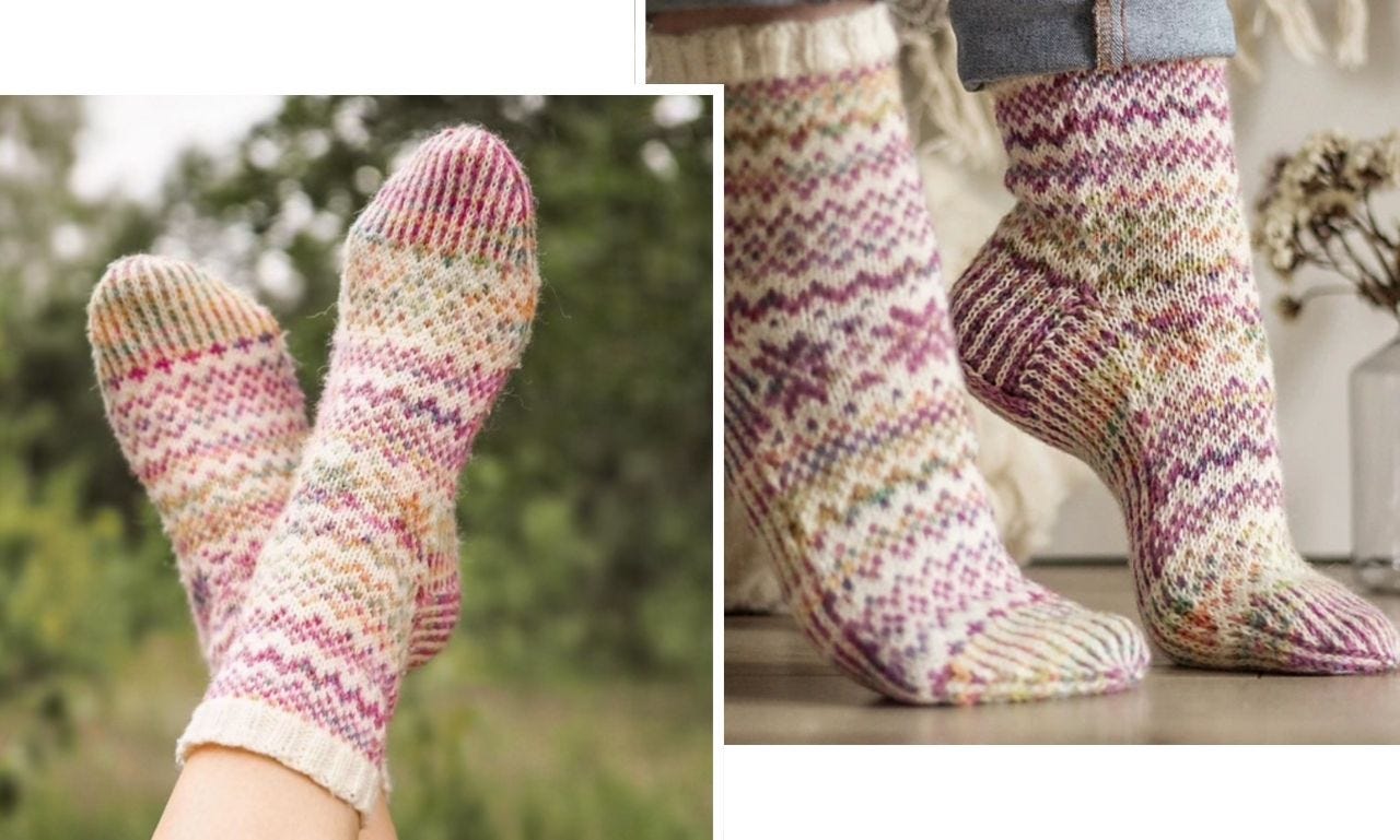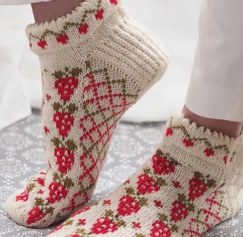“These strawberry socks are the sweetest pair of the summer. The thin Novita Venla yarn is a perfect choice even for intricate and detailed colourwork patterns.”