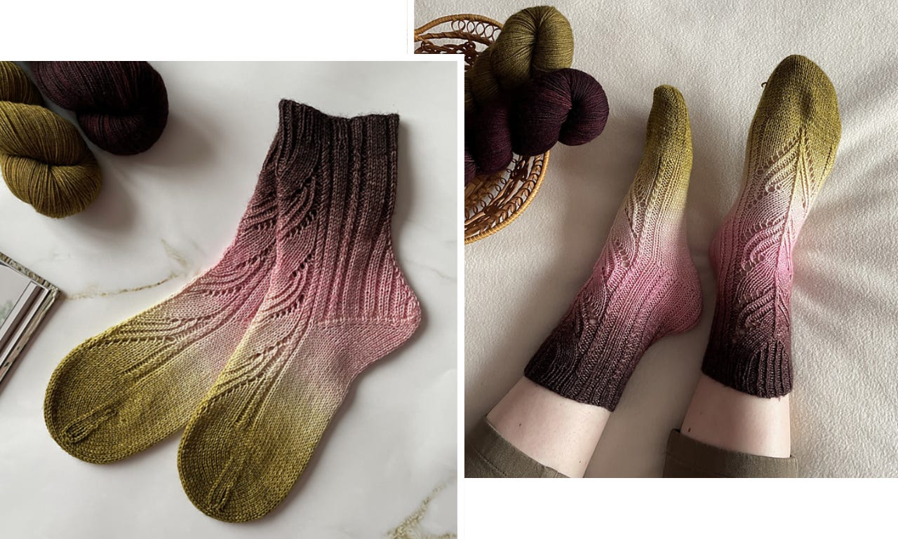 “Top down mid-calf socks with elegant lace pattern, heel Strong and toe shaping. Perfect for hand dyed and gradient yarns!”
